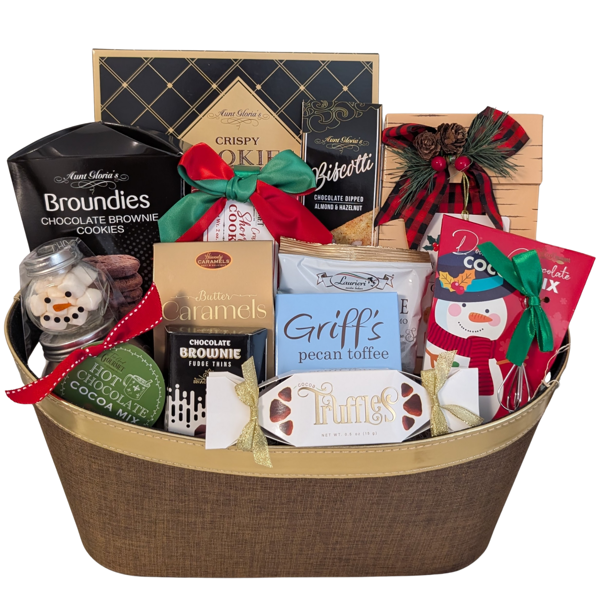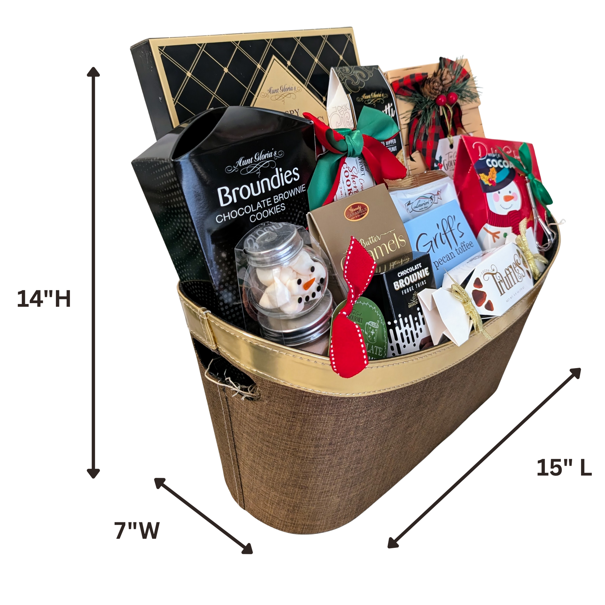 This beautifully crafted brown faux leather gift basket is brimming with an assortment of decadent chocolates, cookies, cocoa, caramels, and other delightful treats. Perfectly suited for any celebration, it offers a thoughtful selection to be savored and enjoyed. The impressive decorative basket not only makes a stunning presentation but also serves as a stylish addition for home or office decor, perfect for storage or display.